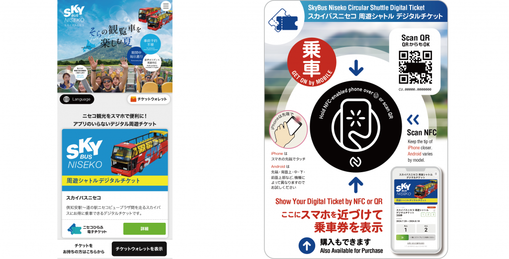 チケット購入ページとチケットを使用する際にタッチするNFCプレート
